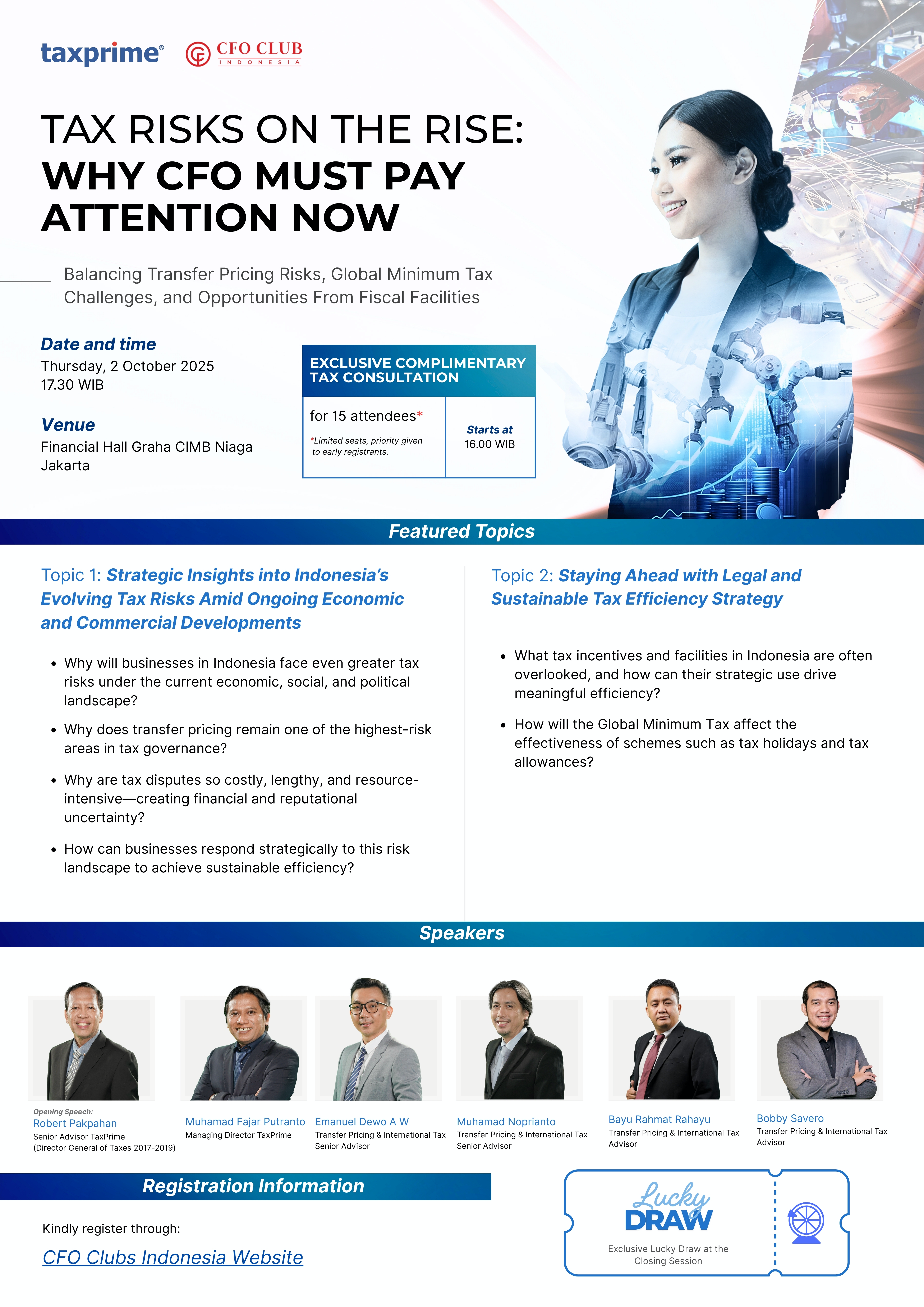 TaxPrime in collaboration with CFO Club Indonesia is pleased to invite you to join our seminar: “Tax Risk on the Rise: Why CFO Must Pay Attention Now”